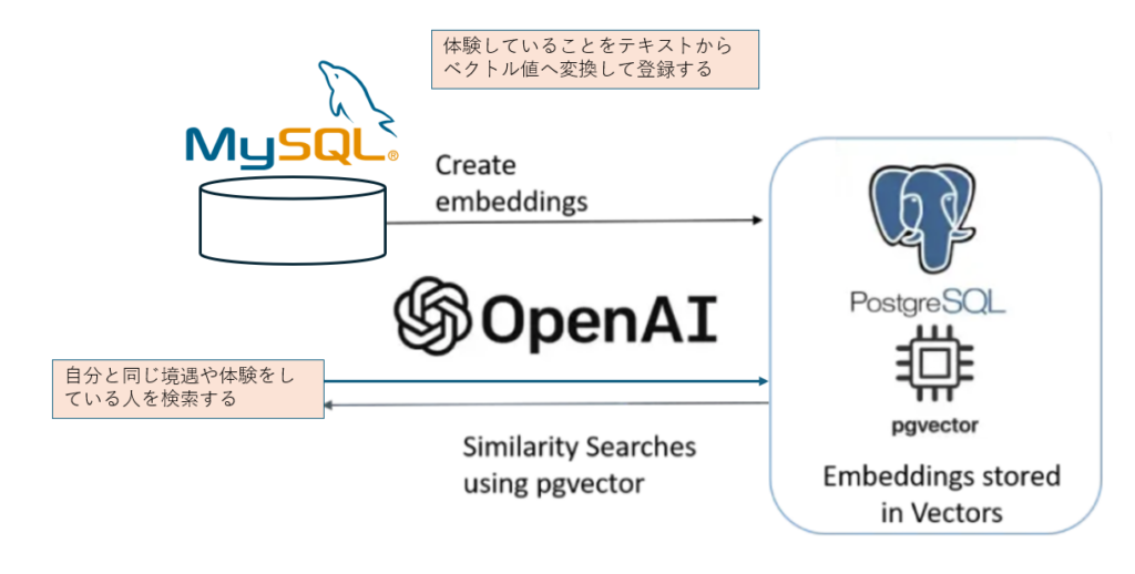 [1]あらかじめ過去の経験・体験のテキストからOpenAI APIでベクトル値を取得して、そのベクトル値をvector型のフィールドに保存しておく。