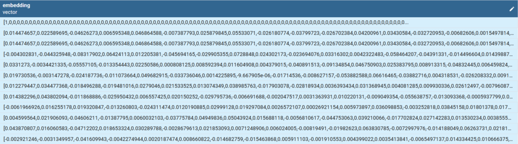 これを利用するには、PostgreSQLをDBにして、pgvectorという拡張機能を利用したうえで、例えばOpenAI APIでベクトル数値に変換したベクトル値自体をvectorとしての型フィールドに保存しておけばSQLで判断できるようになるっていう仕組みです。