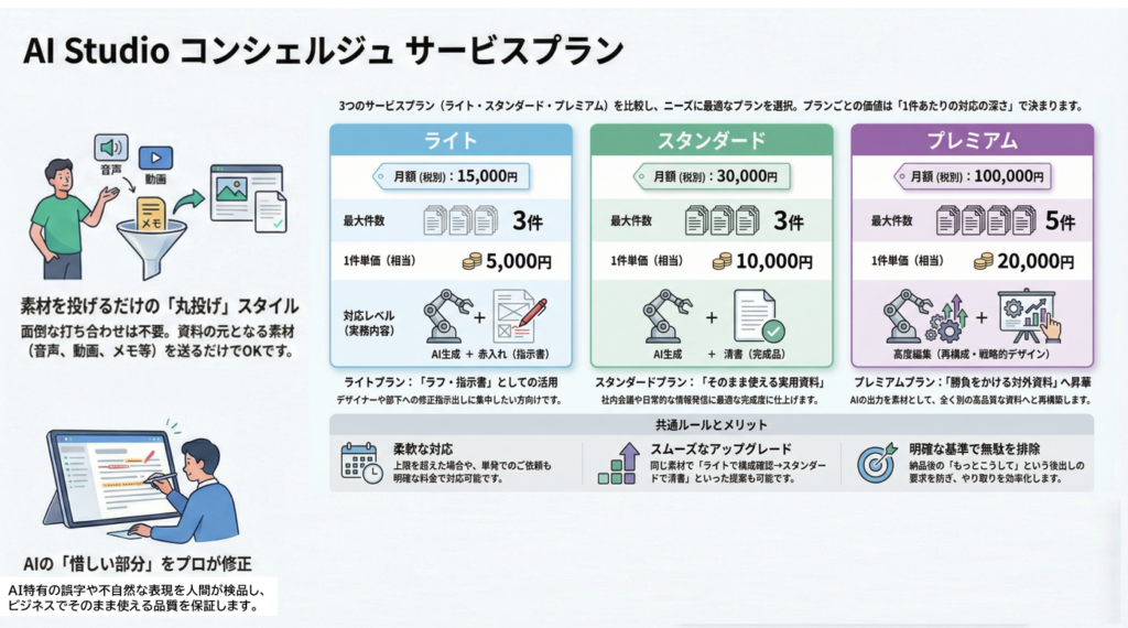 スタンダードプラン (Standard Plan): これは「ビジネスレディ」モデルです。AIが生成したアウトプットに対し、こちらで責任を持って誤字や不自然なフォントを修正し、文章のトーンを整えます。クライアントは受け取った資料を、修正の手間なくそのまま会議やSNSで使える状態で受け取ることができます。「今すぐ使いたい」というニーズに完全に応えるプランです。