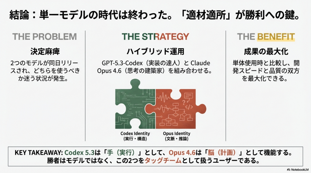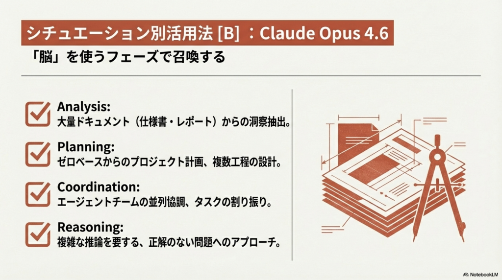 - Opus 4.6の選択理由: 巨大なコードベースの理解、深い論理的推論、セキュリティ監査、複雑なドキュメント解析が必要な場合。