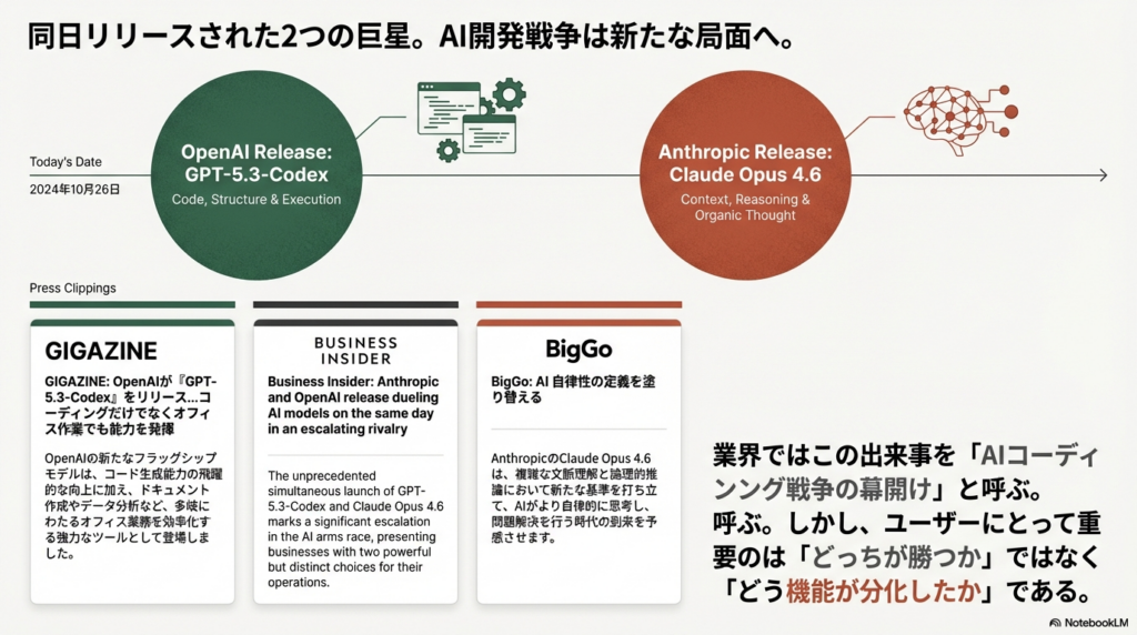業界では、この同日リリースを「AIコーディング戦争の幕開け」と表現する見方もあります — 競争が激化し、ツールが一気に進化する局面です。