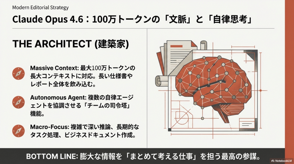 AnthropicのフラッグシップモデルであるOpus 4.6は、大規模な情報処理と深い推論に特化している。