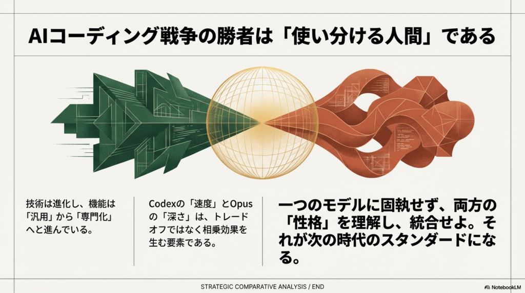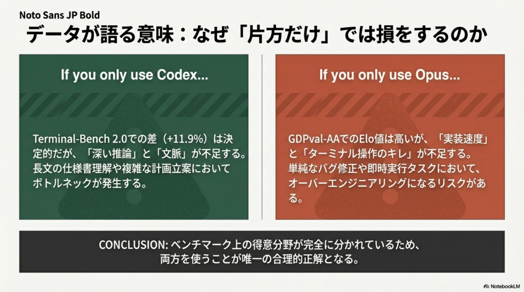→ 単一モデルで全てをカバーするのは非効率 - 両者比較では、Codex が高速・高精度コーディングで競争力