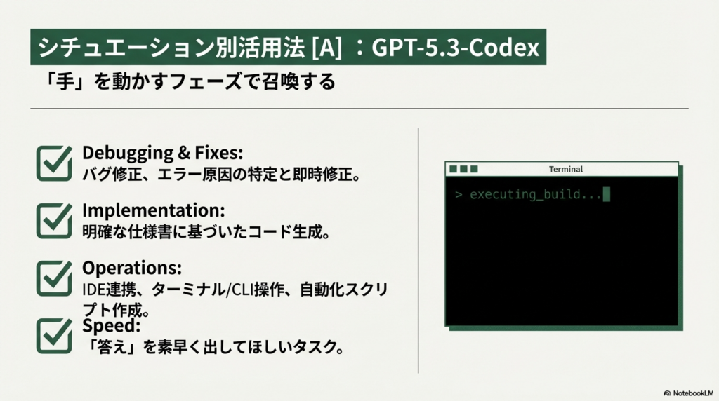 - GPT-5.3-Codexの選択理由: 迅速な反復開発、リアルタイムの共同作業、OS環境と連携したエンドツーエンドのタスク自動化が必要な場合。