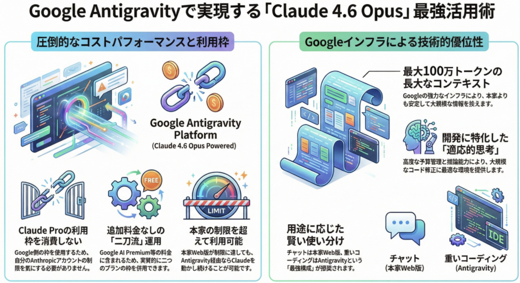 Antigravity経由でClaude 4.6 Opusを利用する際の最大の特徴は、そのコスト構造と独立した利用枠にある。