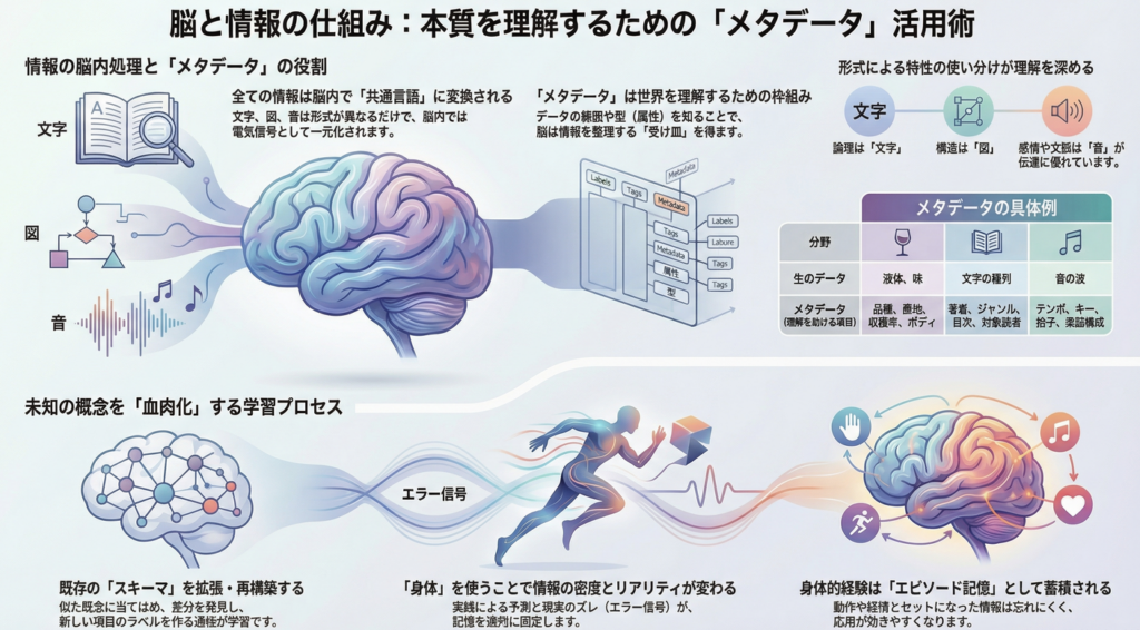 情報の形式(入れ物)は異なれど、脳内では最終的にニューロンの電気信号という「共通言語」へと翻訳される。情報は単なるデータの羅列ではなく、その背後にある「メタデータ(情報の情報)」や「解釈の枠組み(スキーマ)」を理解することで、初めて知識として定着する。