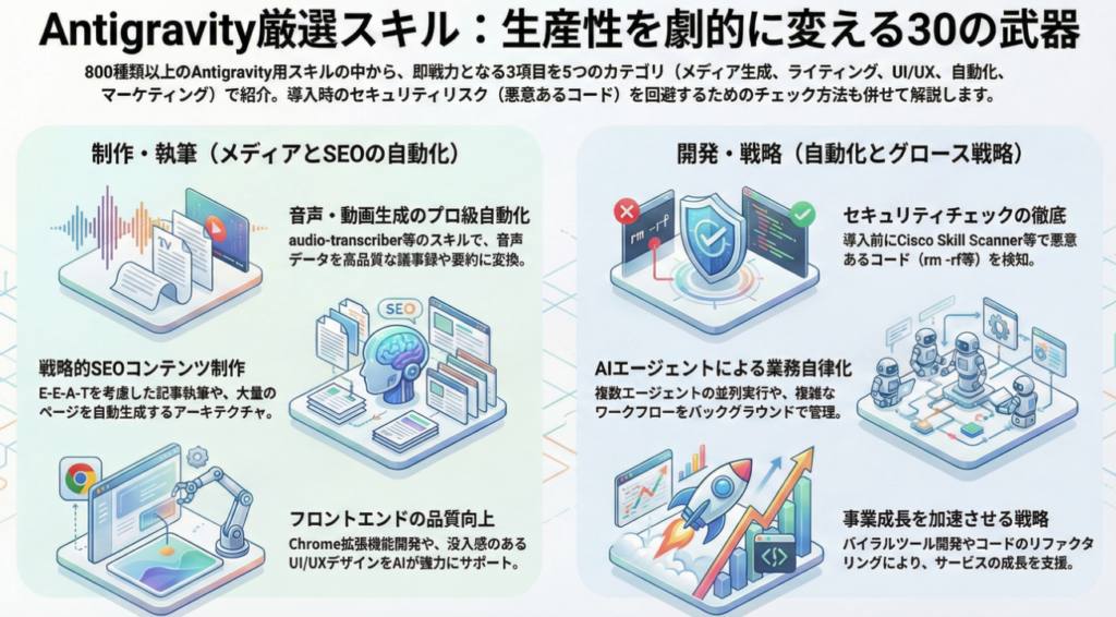 Antigravity用にピックアップされたスキルは、以下の5つの主なカテゴリに分類されており、それぞれ具体的な活用例が挙げられています。