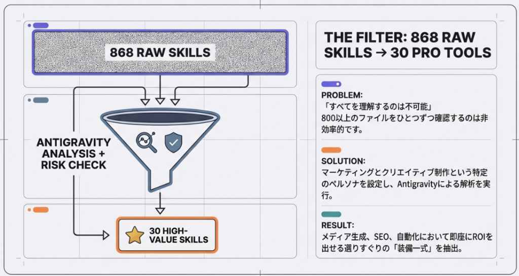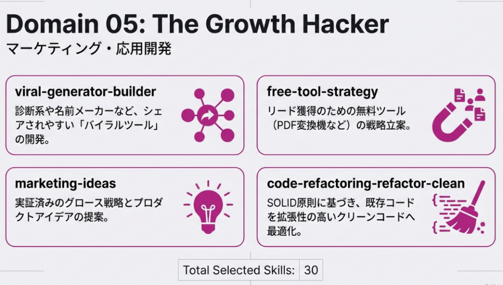 Antigravityの真価は、複数のスキルを組み合わせた「複利の生産性」にあります。単なる作業効率化ではなく、ビジネスモデルそのものを自動化する強力なスキル群を紹介しましょう。