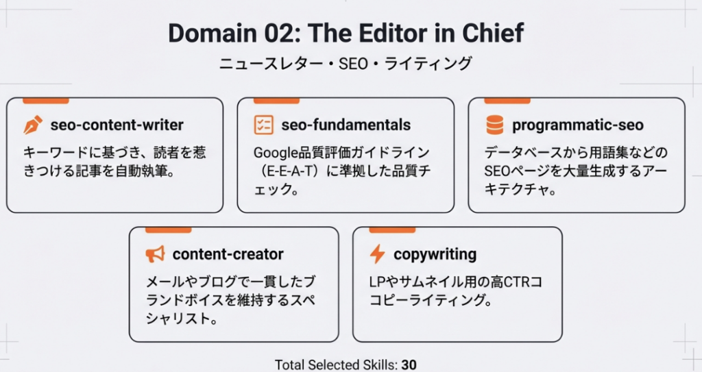 「seo-content-planner」で戦略を練り、一貫したトーンで大量の高品質記事を世に送り出す。AIに編集プロダクションの全機能を装備させることで、ブランドの重厚さと圧倒的な拡散力を両立できるのです。