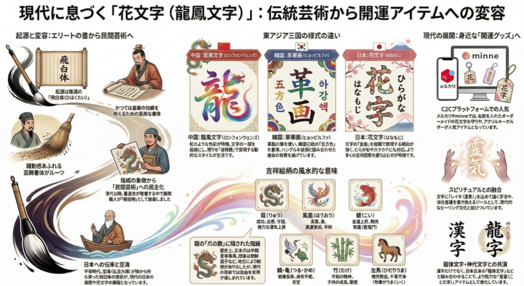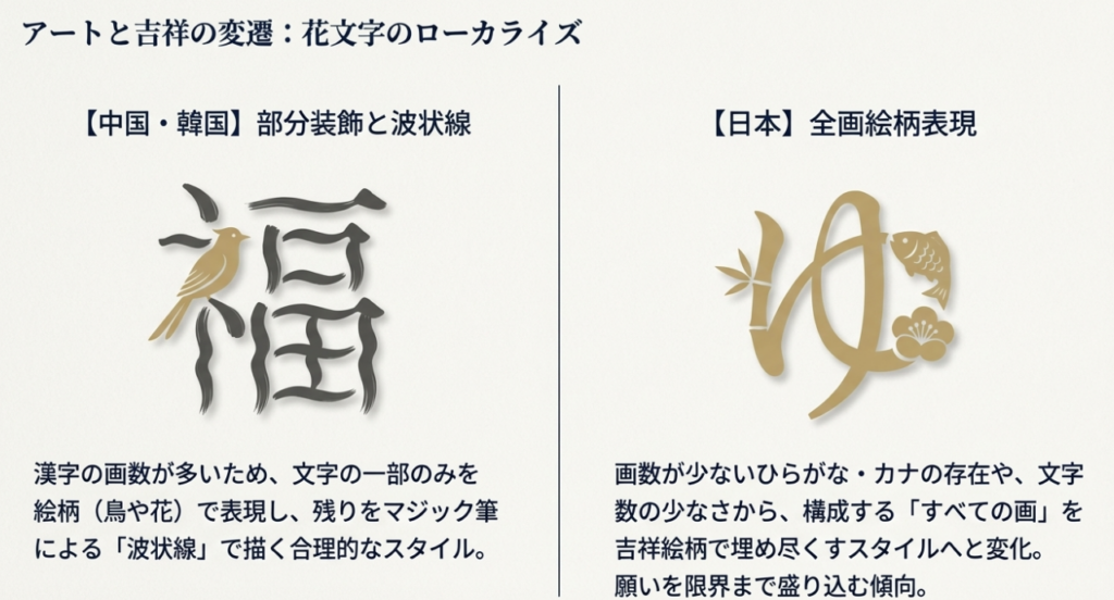 中国の「花鳥字」や韓国の「革筆画」を源流とする装飾文字は、日本で独自の進化を遂げた。画数の一部のみを絵にする中国流に対し、全画を精緻な吉祥画で構成する「日本流花文字」は、その圧倒的な視覚的インパクトにより、現代の「開運」ニーズを象徴する造形となっている。