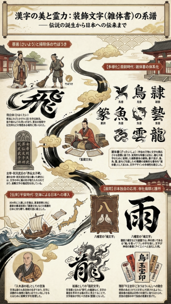 装飾文字の系譜は、古代中国における「雑体書(ざったいしょ)」の隆盛にまで遡る。これは文字の画に鳥、魚、雲、龍といった自然界の万物を模した意匠を組み込んだものであり、東アジアの造形文化に決定的な影響を与えた。