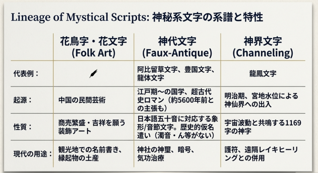 江戸時代から明治にかけて、日本には漢字伝来以前の古代文字が存在したとする「神代文字(じんだいもじ)」の議論が活発化した。しかし、ここで注目すべきは、歴史的遺物としての神代文字とは一線を画す「神界文字(しんかいもんじ)」という概念である。