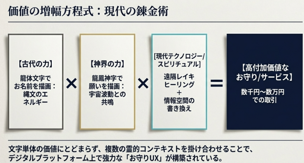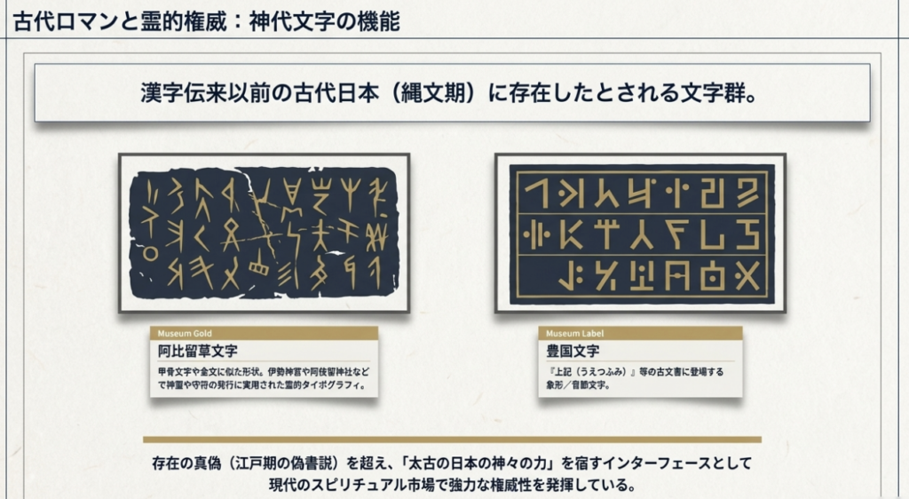 これらの文字は、もはや国家の権威を示す道具ではなく、個人の救済やスピリチュアルな覚醒へと接続される「神界の記憶」として再定義されている。