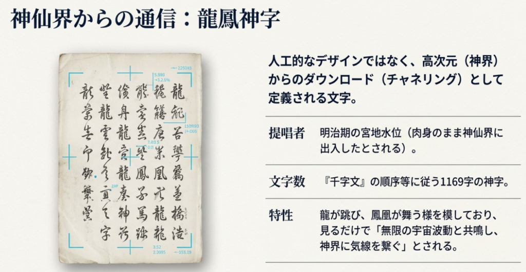 明治時代の神道家・宮地水位は、肉身のまま神仙界に出入し、異界の文字を持ち帰ったとされる。その代表が、1169字に及ぶ「龍鳳文字」である。 水位が編纂した『鴻濛字典(こうもうじてん)』は、『千字文』の順序に従ってこれらの文字を整理したものである。これは単なる古代の模倣ではなく、文字そのものが特定の「宇宙波動」と共鳴し、見る者の情報空間を神界と接続させる多次元的な回路として定義されている。