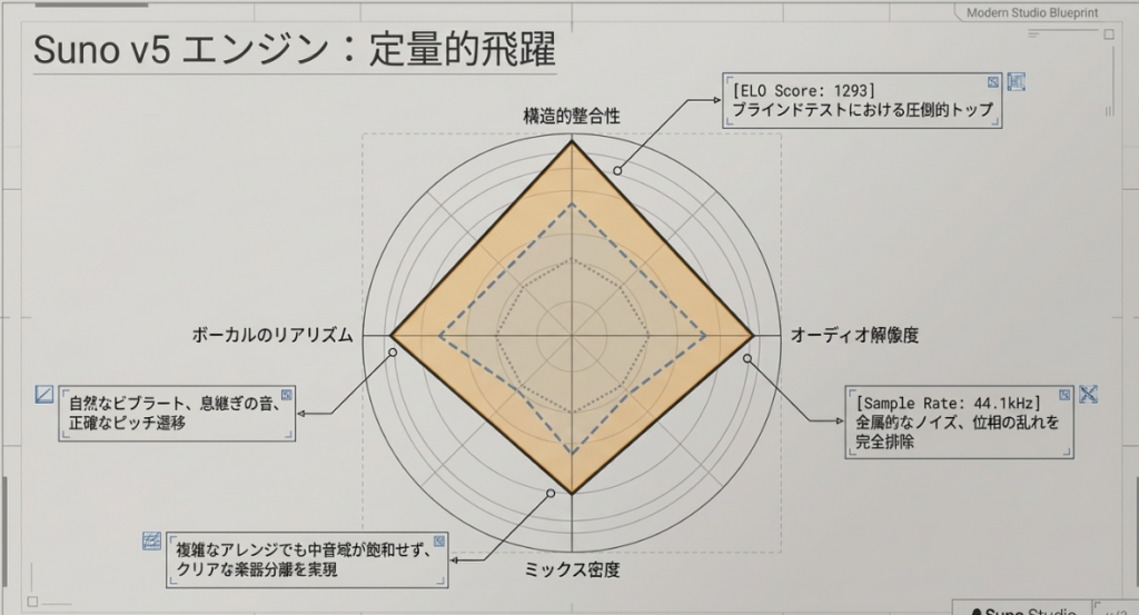 Suno V5は、ベンチマークテストにおいてELOスコア1,293という、業界のゴールドスタンダードを記録しました。これは、AIが「高度なセッションミュージシャン」として実用レベルに達したことを証明しています。