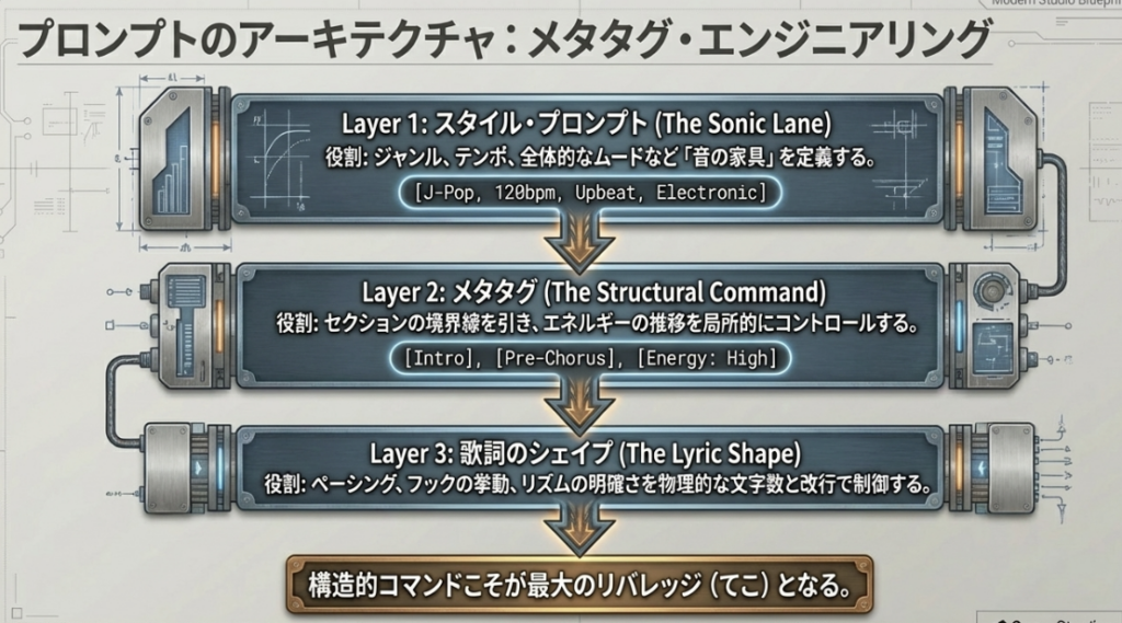 プロフェッショナルな制作では、曖昧な指示は不要です。V5では「スタイル・プロンプト(音の方向性)」と「歌詞・プロンプト(楽曲構造)」を分離し、メタタグを用いた「設計図」を作成することが推奨されます。
