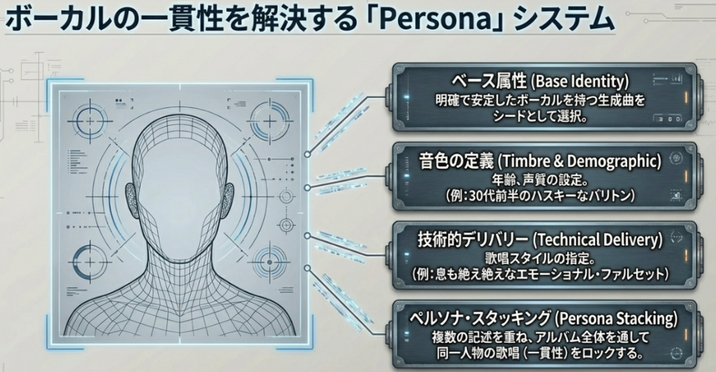 「ペルソナ機能は、複数のトラックにわたって一貫したボーカルスタイルを維持するための決定的な解決策である」