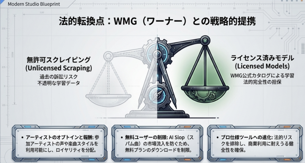 2025年末、SunoはWarner Music Group(WMG)との戦略的提携を発表し、業界の風景を一変させました。これは単なる和解ではなく、AIと権利者が共生する「新しい経済圏」の構築です。
