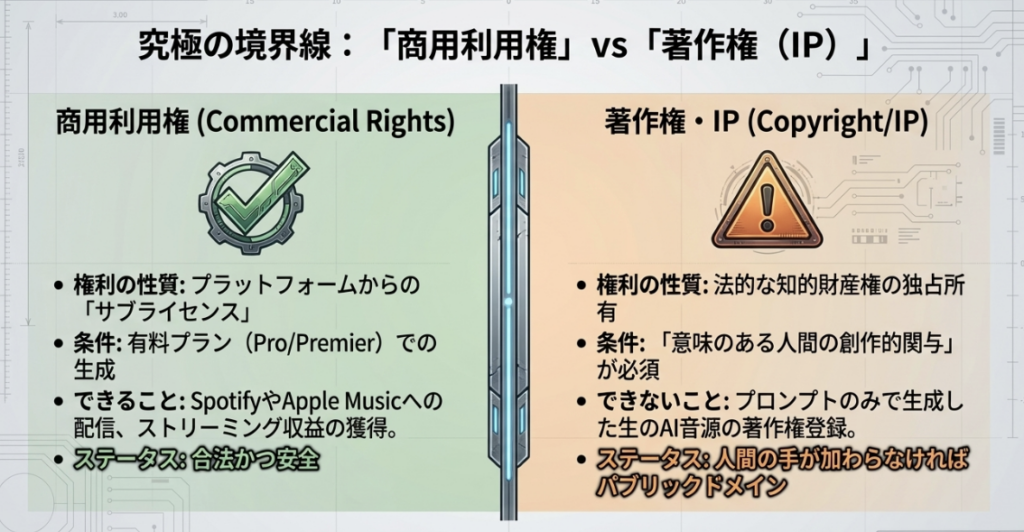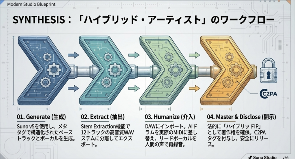各国の法制度では、プロンプトから生成されただけの楽曲は**「パブリックドメイン(公有)」と見なされるリスクが極めて高いのが現状です。法的保護を確実にするには、以下の「十分な人間による創作性」を介在させるハイブリッド・アーティスト・パラダイム**が不可欠です。
