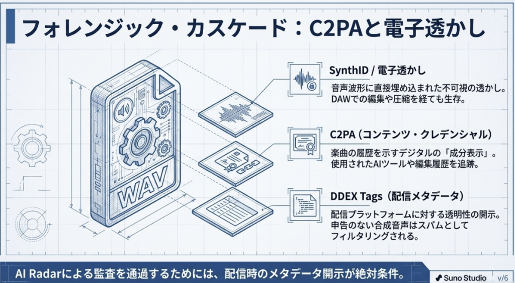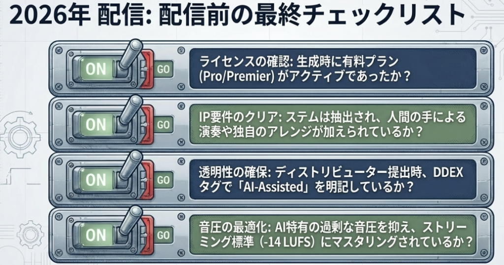 また、V5の生成物にはGoogle DeepMindの**「SynthID(不可視の電子透かし)」**が含まれています。配信プラットフォームでAIの関与を隠蔽することは、トラック削除のリスクを伴います。透明性の確保こそが、プロとしての最低条件です。