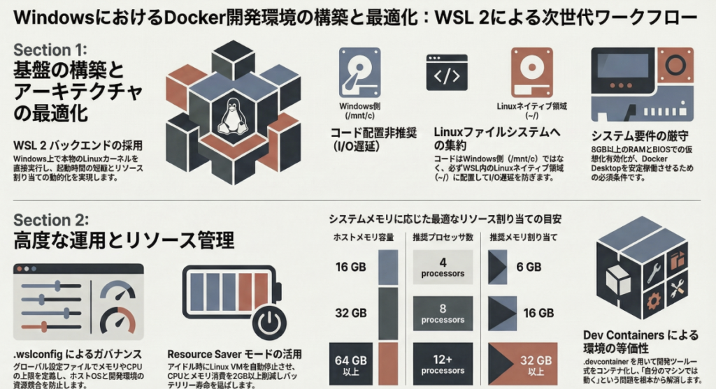 しかし、Windows Subsystem for Linux (WSL) 2の登場は、まさに決定的なパラダイムシフトをもたらしました。現在、適切な最適化さえ施せば、WindowsはLinuxネイティブ環境をも凌駕する、極めて洗練されたクラウドネイティブ開発基盤へと進化します。今回は、多くの開発者が「なんとなく」使っているDockerの設定を、最高の実戦兵器へと変えるための5つの真実を解き明かします。