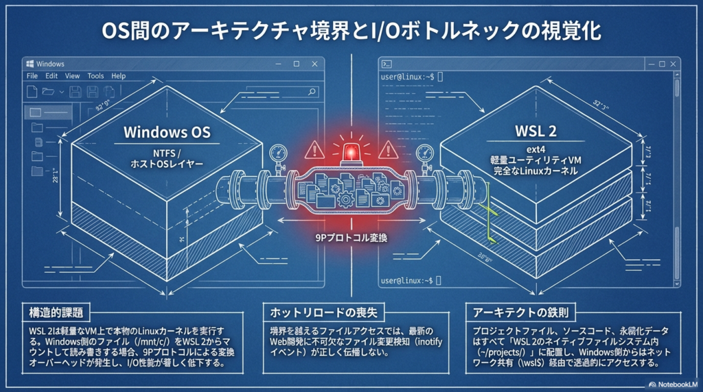 WSL 2環境における最大のアンチパターンは、プロジェクトファイルをWindows側(/mnt/c/以下など)に置いたままコンテナへマウントすることです。これは単に「少し遅い」というレベルではなく、アーキテクチャ上の致命的なボトルネックを引き起こします。