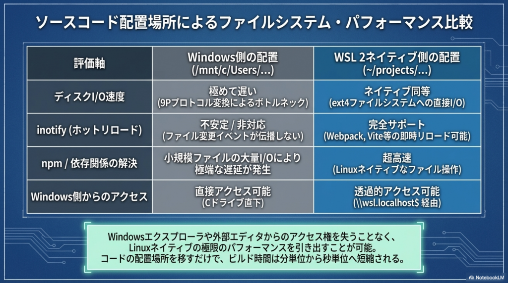 node_modulesのような大量の微細なファイルを扱う際、このカーネル間通信のオーバーヘッドは累積し、ビルドやインストールに数倍から十数倍の時間を強いることになります。また、ファイルの変更を検知するinotifyイベントが境界を越える際に消失しやすく、ホットリロードが機能しないといった開発体験の阻害も招きます。