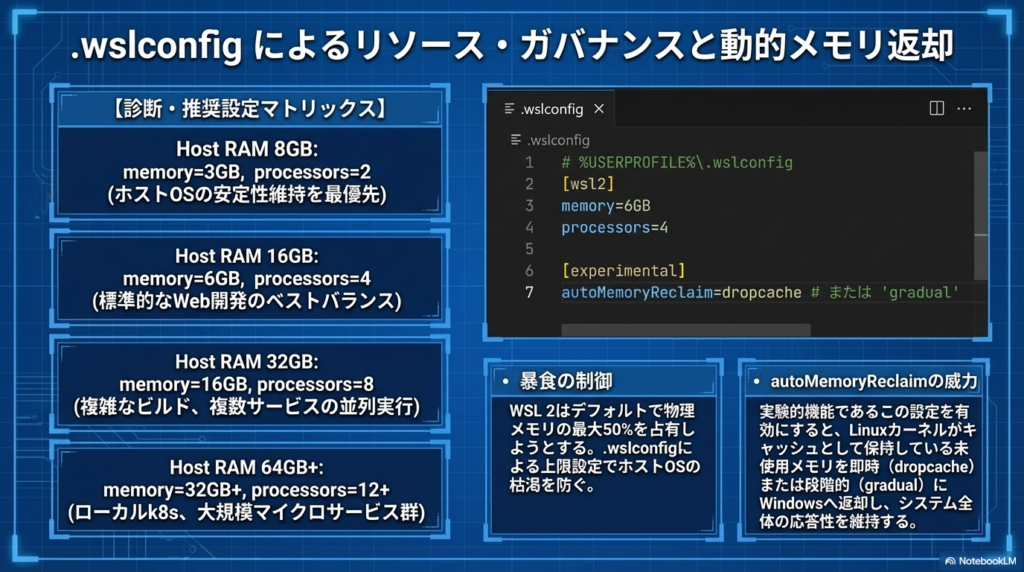 Windows (WSL) において、Resource SaverはCPU使用率を下げますが、メモリ(RAM)の占有分は自動的には解放されません。 開発が終わっても「Vmmem」プロセスがメモリを抱え込み続ける問題には、.wslconfigでの戦略的な制御が必要です。