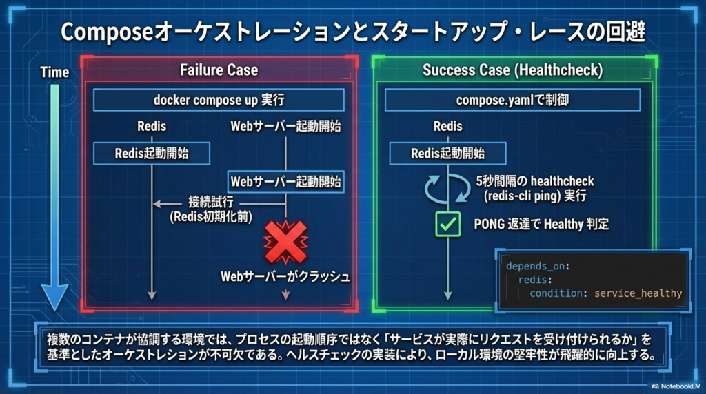 Redisやデータベースが「内部的に準備完了(healthy)」になる前にアプリが接続し、クラッシュする現象は、以下の記述で過去のものになります。