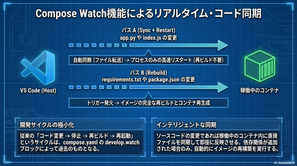 compose.yaml内のdevelop.watch設定は、保存と同時に変更を反映させます。特筆すべきは、変更の種類に応じた「振る舞いの使い分け」です。