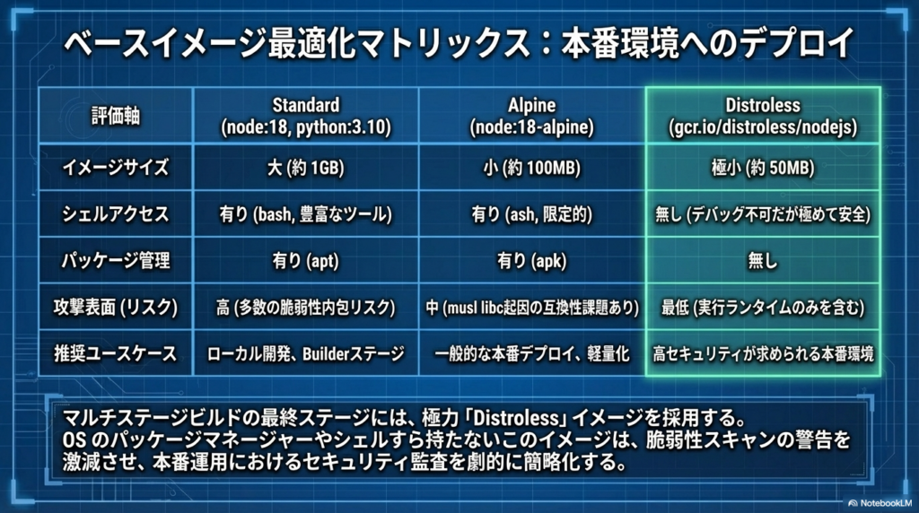 イメージサイズの削減を、単なるディスク容量の節約だと考えていませんか? プロフェッショナルにとって、イメージの軽量化とは**「攻撃表面(Attack Surface)の最小化」**を意味します。