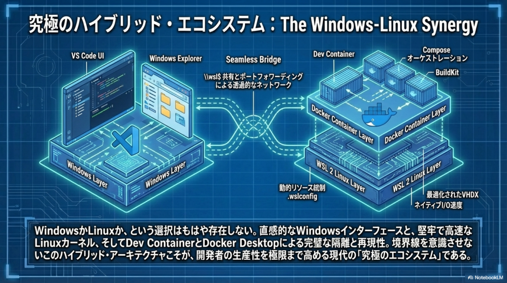 Windowsは、WSL 2とDocker Desktop、そしてVS Codeの三位一体によって、今や最も強力な開発プラットフォームの一つとなりました。かつての「重さ」は技術の限界ではなく、構成の最適化不足に過ぎなかったのです。