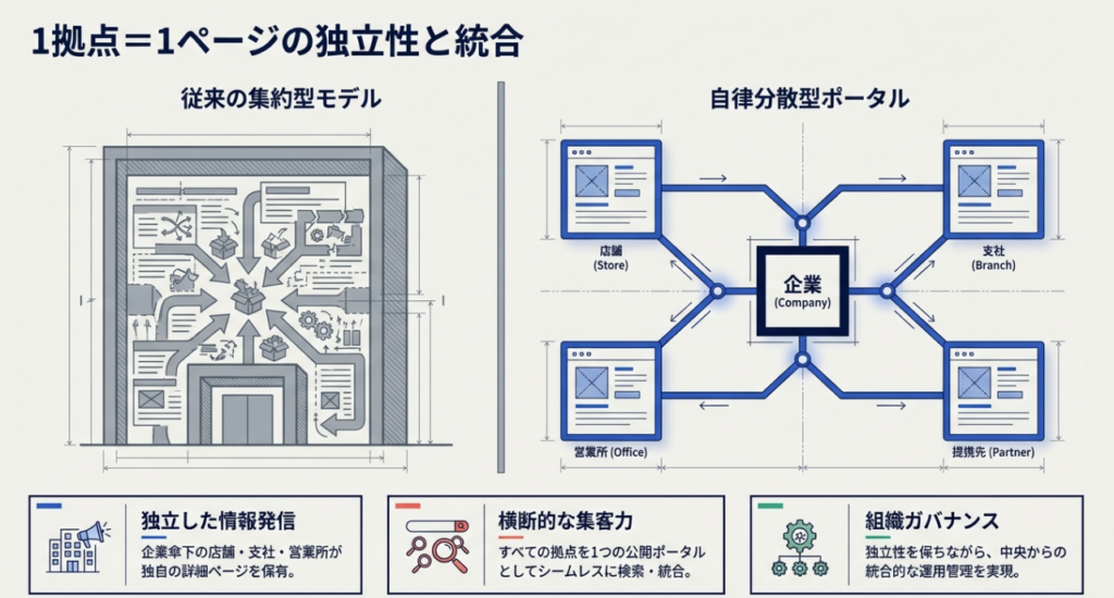 多拠点を展開する企業において、デジタル上の情報発信はしばしば「カオス」に陥ります。本部の統制が効きすぎれば現場の熱量が失われ、各拠点に任せきりにすればブランドイメージは霧散し、ユーザーが求める情報への検索性は著しく低下します。この「情報の分断」は、現代のビジネスにおいて深刻な機会損失を招いています。