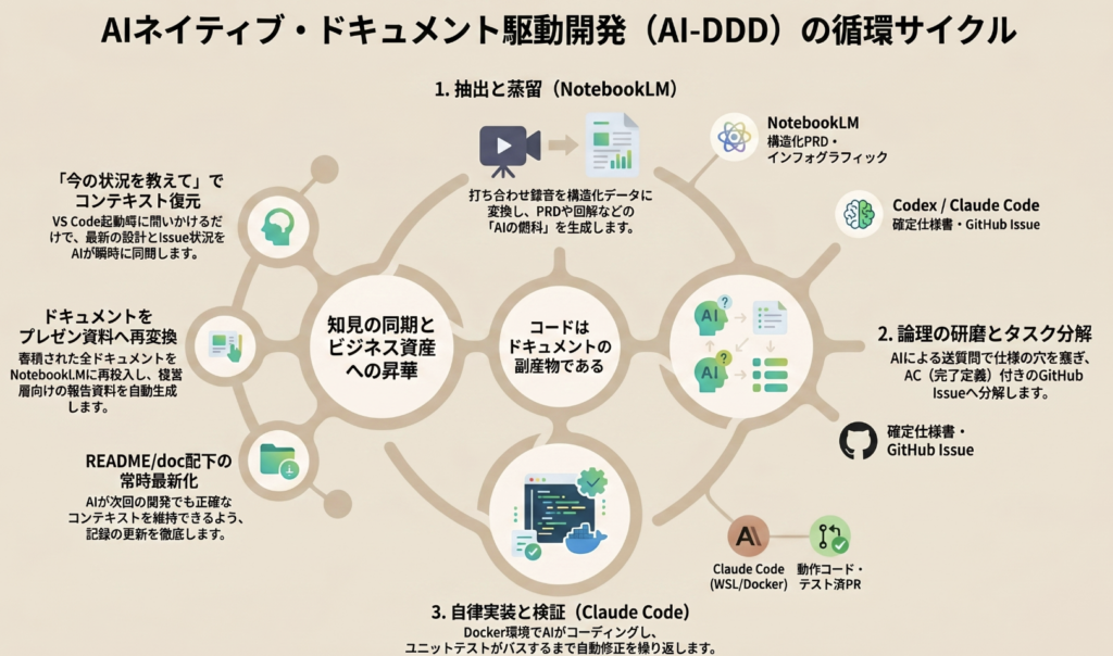 - 【昇華】 全成果物をNotebookLMへ戻し、プレゼン資料や次なる設計へと循環させる。