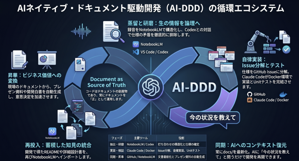 人間が意思決定(Why/What)に特化し、AI(Claude Code/Codex)が執行(How)を担う分業モデルにおいて、ドキュメントは単なる記録ではなく、AIを駆動させる「実行可能な仕様書」として機能する。この戦略の最大益は、開発プロセスの「脱ブラックボックス化」である。ドキュメントを「正」のエンジンとすることで、AIは常に最新の設計意図を把握し続け、長期的なプロジェクト保守における技術負債の蓄積を根本から抑止する。