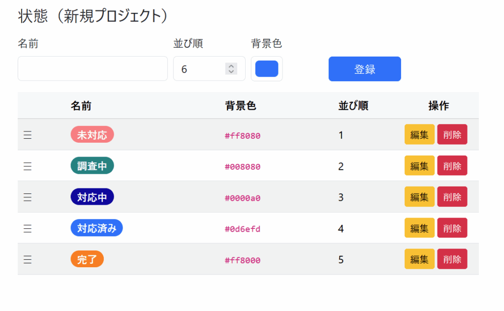 これはプロジェクトごとに設定できる状態マスタの登録例。それぞれの名前ごとに背景色を設定することができる。文字色が白と固定の場合に発生する問題が、背景色と文字色の関係で、見えにくいとか完全に見えないという問題だ。