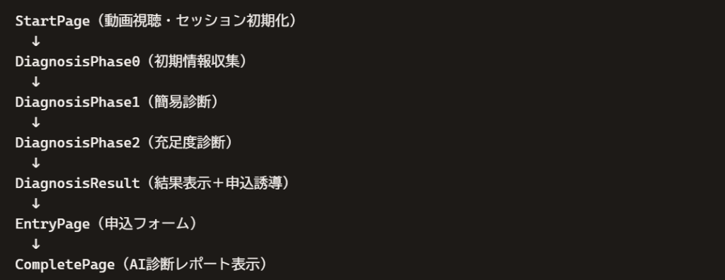 | Phase0/Result | postComplete() | /api/diagnosis/complete | 診断完了・ユーザー情報保存 |