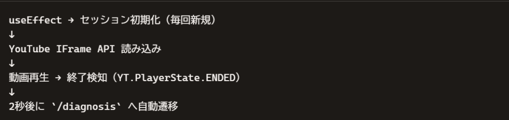 | 動画再生 | YT.Player を playerRef に格納し、終了イベントで navigate("/diagnosis") |