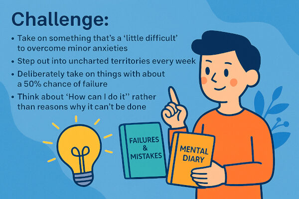 💡 挑戦がないと、現状維持が“退化”になります。成長には“ストレッチゾーン”が必要です。1.0倍ではなく、1.1倍以上の成長を繰り返す癖をつけていくことを感じられるとよいでしょう。